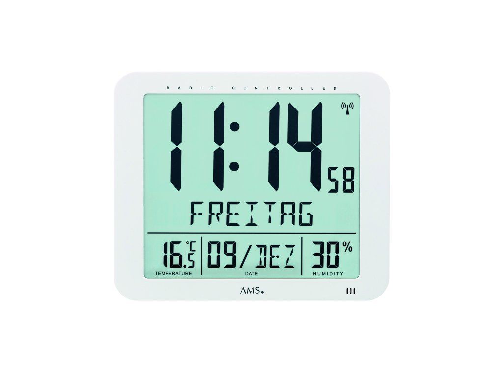 Rádiem řízené digitální hodiny, které jsou kombinované - tzn. nástěnné či stolní. Režim zobrazení času 12/24h. Hodiny mají funkci alarmu a kalendář až do roku 2099. Zobrazení dne v týdnu lze zvolit až z 10 různých jazyků. Ukazatel teploty s rozmezím -10°C až +50°C a s volbou °C/°F. Ukazatel vlhkosti s rozmezím 20% až 99%. Tyto hodiny jsou v bílé barvě. Na zadní straně hodin je prostor pro vložení 4x AA tužkových baterií.