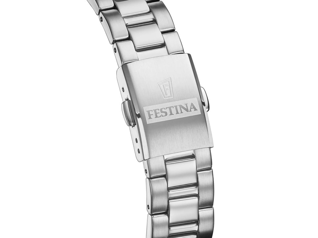 Kovový tah typu Oyster z kvalitní oceli ve stříbrné barvě je zakončen překlápěcí sponou, která zajišťuje bezpečné a pohodlné zapínání. Náramkové hodinky dámské Festina jsou tak nejen krásné, ale i maximálně komfortní při celodenním nošení.