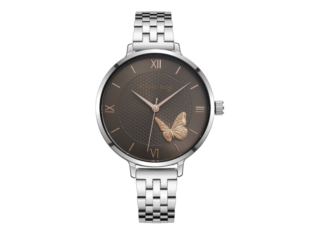 Hnědý ciferník hodinek je zdobený drobným motýlkem a elegantními indexy a římskými čísly, které dodávají hodinkám nezaměnitelný šarm. Kovový řemínek ve stříbrné barvě je nejen stylový, ale také odolný vůči opotřebení.
