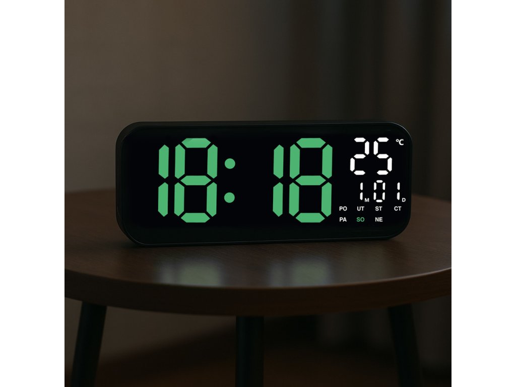 Elegantní černé provedení v oválném provedení a výrazné zelené a bílé digitální číslice zajišťují snadnou orientaci v čase za všech podmínek. Díky celoplošnému LED podsvícení jsou tyto digitální hodiny perfektně viditelné i ve tmě. Další výhodou tohoto digitálního budíku je jeho nastavení jasu.