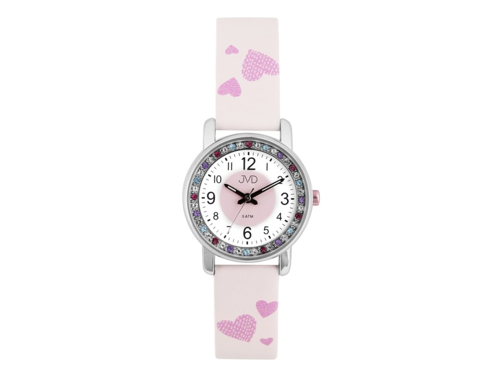 Dívčí hodinky JVD zaujmou na první pohled kulatým stříbrným pouzdrem o průměru 28 mm, které je vyrobeno z bezniklové slitiny. Krásně jej doplňuje bílý číselník lemovaný barevnými zirkony, na kterém jsou přehledně umístěná arabská čísla pro snadné čtení času. Minerální tvrzené sklíčko chrání ciferník před poškrábáním a běžným opotřebením, takže hodinky zůstanou krásné i po delší době používání. Navíc jsou tyto dětské hodinky vybaveny kvalitním quartzovým strojkem Miyota, který je známý svou přesností a spolehlivostí.