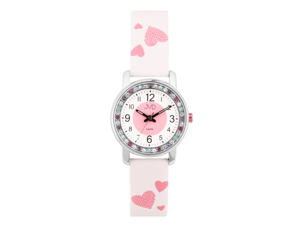Dívčí náramkové hodinky s motivem srdíček JVD J7237.3 růžové quartzový strojek, arabská čísla