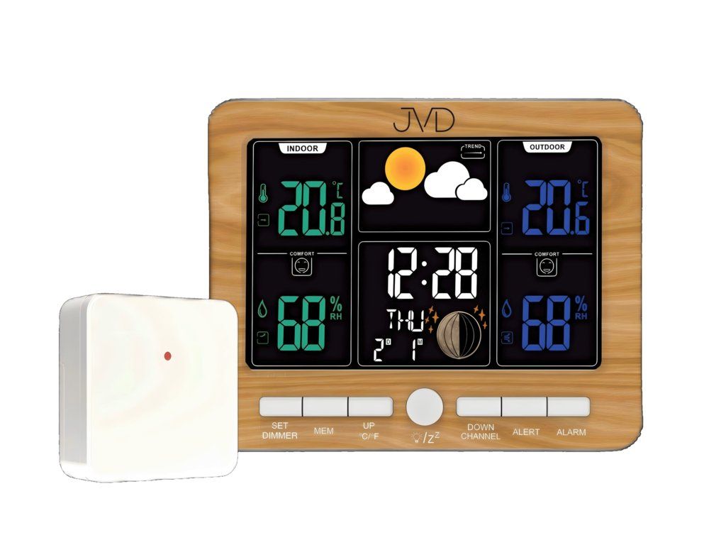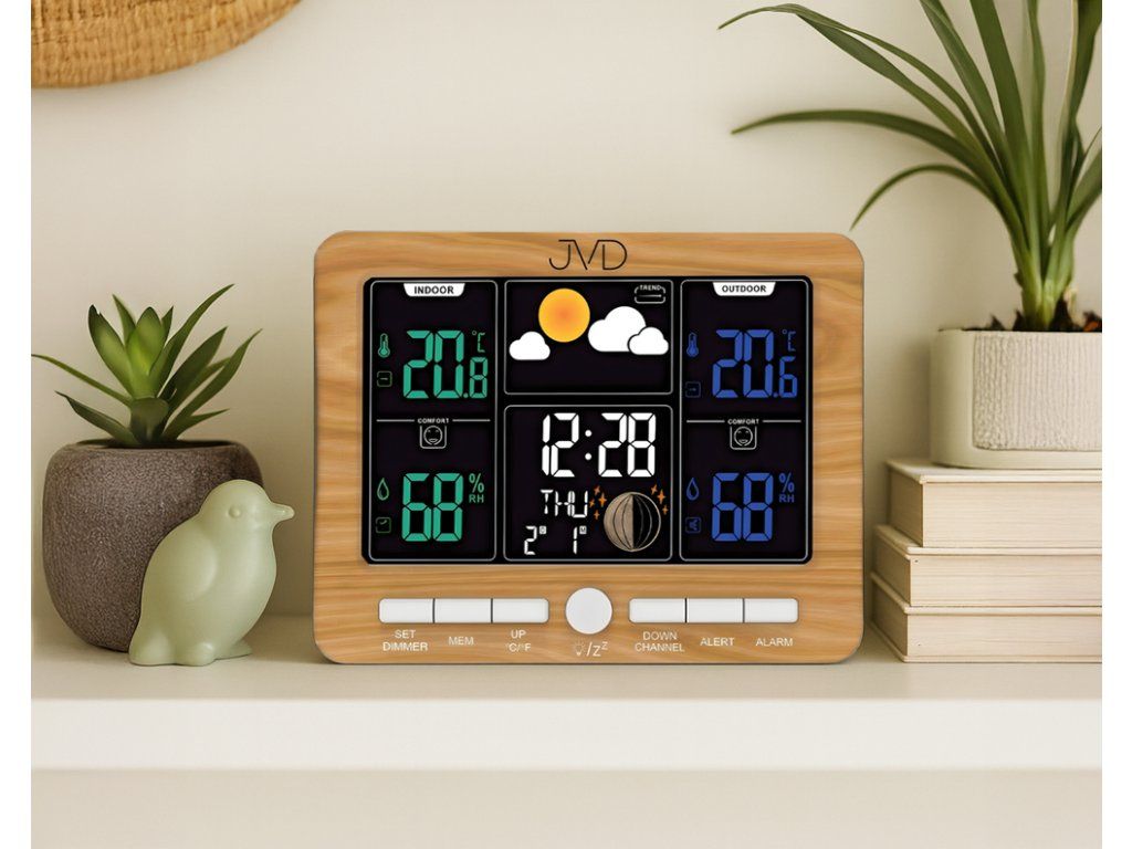 Moderní domácí meteostanice JVD RB6685.2 v elegantním provedení v imitaci dřeva je ideálním pomocníkem pro každého, kdo chce mít přehled o aktuálním počasí i přesném čase. Tato digitální meteorologická stanice kombinuje funkčnost, přehledný design a širokou škálu praktických funkcí, které vám usnadní denní plánování a zlepší komfort každodenního života.
