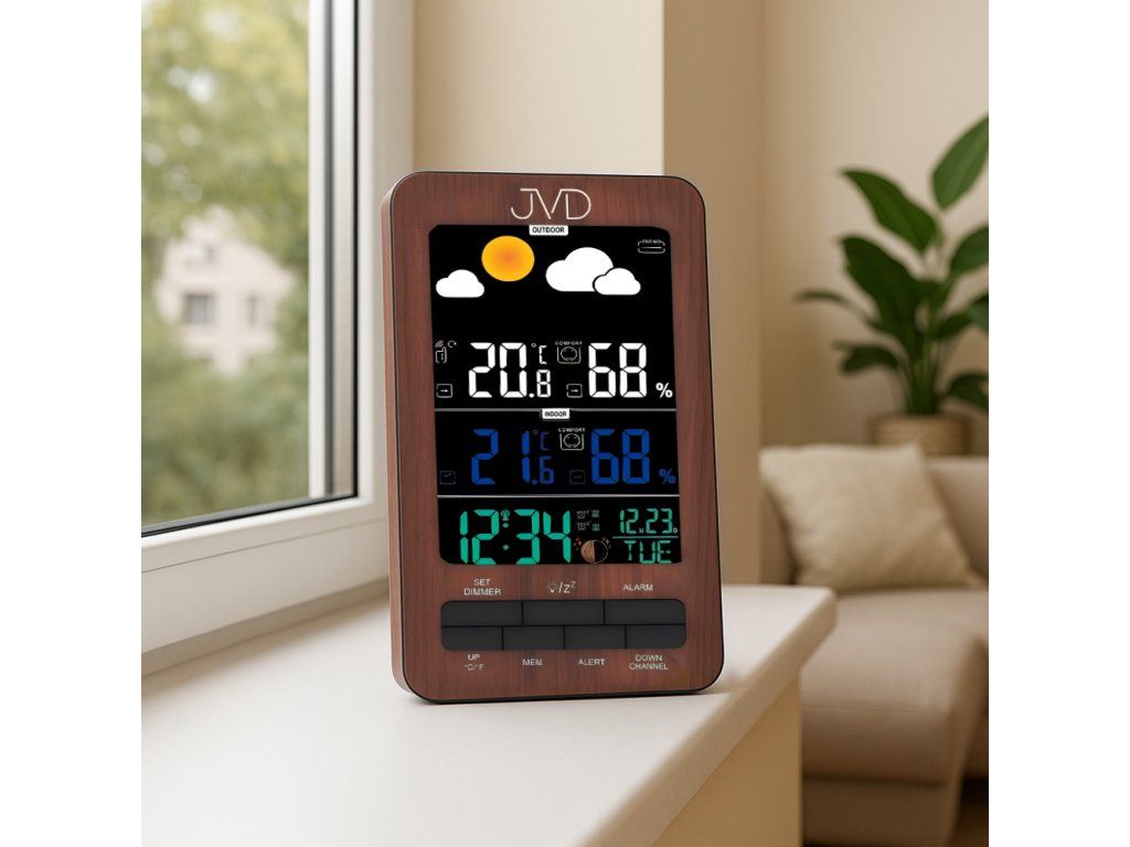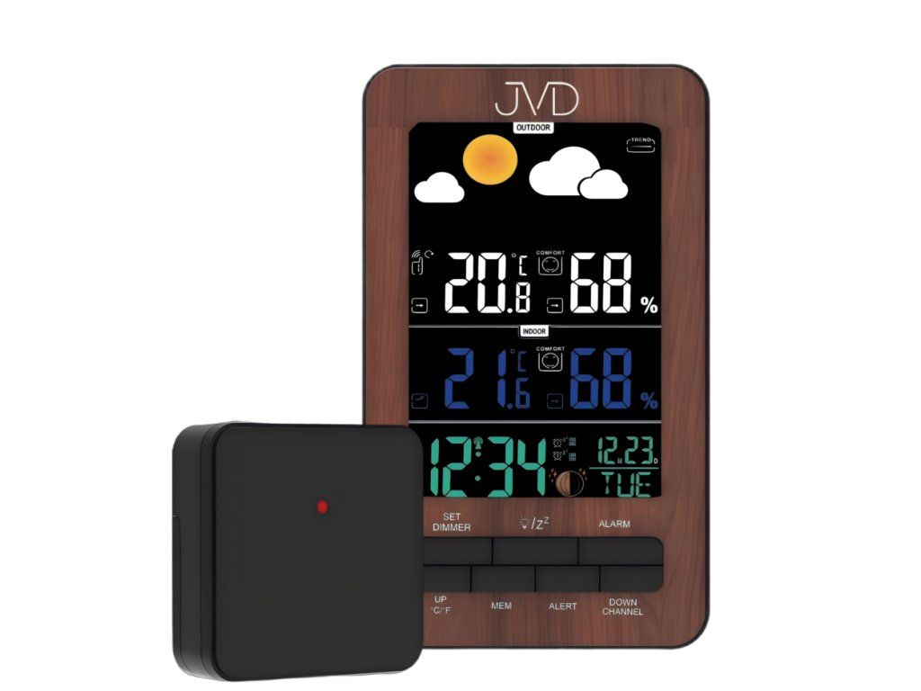Moderní domácí meteostanice JVD RB6687.2 v elegantním provedení imitace dřeva je ideálním pomocníkem pro každého, kdo chce mít přehled o aktuálním počasí i přesném čase. Tato digitální meteorologická stanice kombinuje funkčnost, přehledný design a širokou škálu praktických funkcí, které vám usnadní denní plánování a zlepší komfort každodenního života.