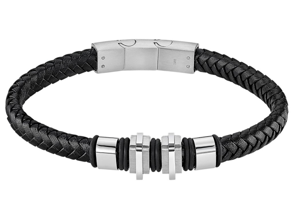 Pánský kožený náramek ocelové kroužky LS2404-2/1 černý chirurgická ocel, kůže