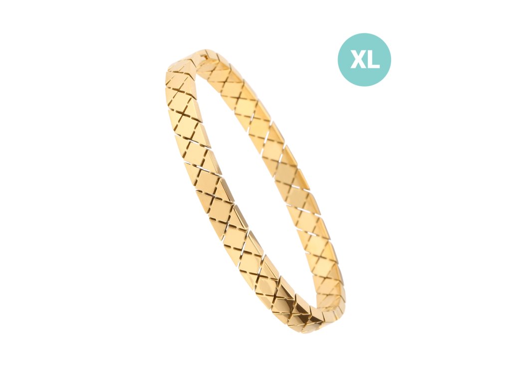 Tento náramek je vyroben z kvalitní chirurgické oceli, což zaručuje odolnost a dlouhou životnost. Jeho povrchová úprava v žlutém zlacení přidává náramku luxusní vzhled, který upoutá pozornost.