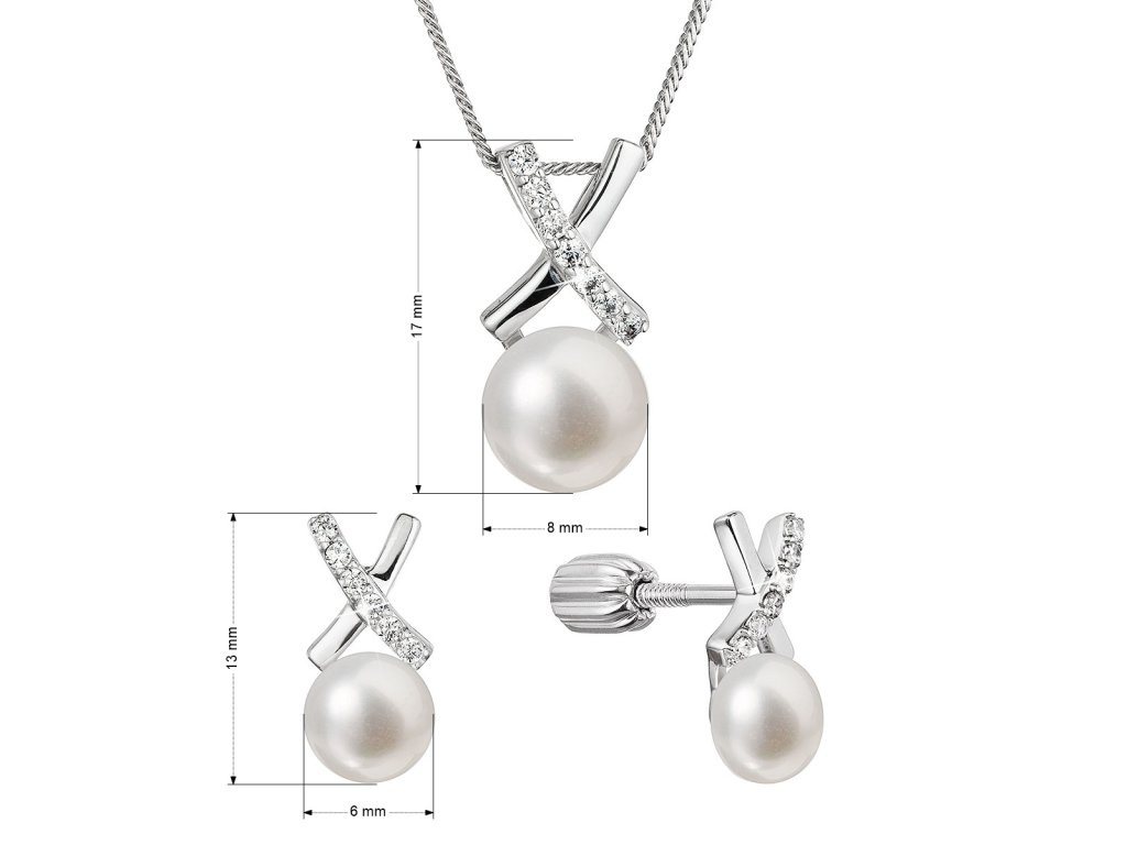 Sada obsahuje stříbrné šperky ve tvaru X, které jsou vyrobeny z kvalitního rhodiovaného stříbra 925/1000. Říční perly přidávájí do designu jedinečný nádech, zatímco čiré zirkony dodávají šperkům jemný lesk. Každý kus je pečlivě vyroben, aby vyhovoval nejvyšším standardům kvality.